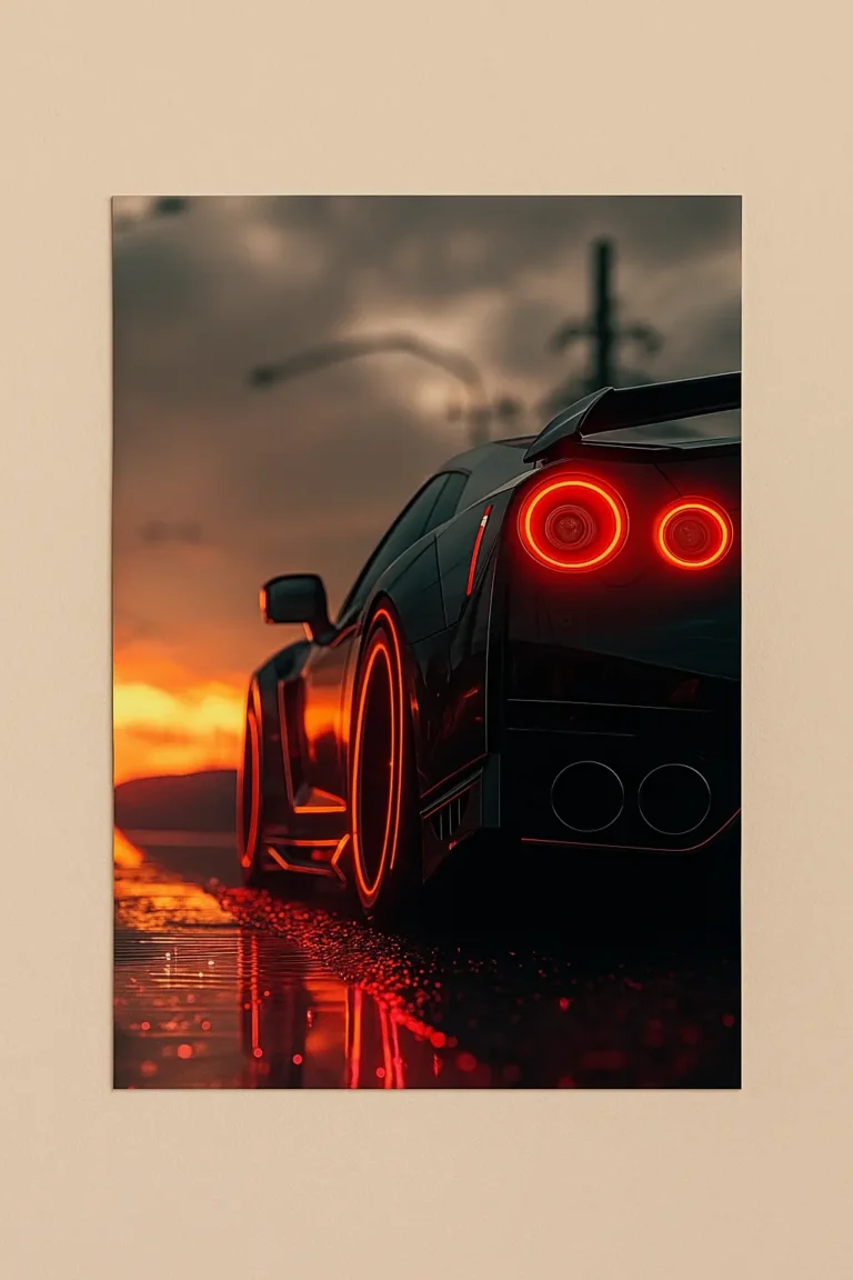 Upgrade your walls with the Nissan GT-R Neon Poster featuring glowing red taillights and sunset effect. A premium wall art choice for car enthusiasts, gamers, and modern interiors in Pakistan.